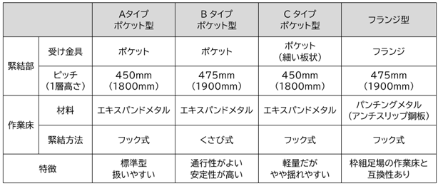 それぞれの緊結部の形状・ピッチ・作業床の仕様が異なるため、現場の用途に応じて最適なタイプを選ぶことが重要です。
