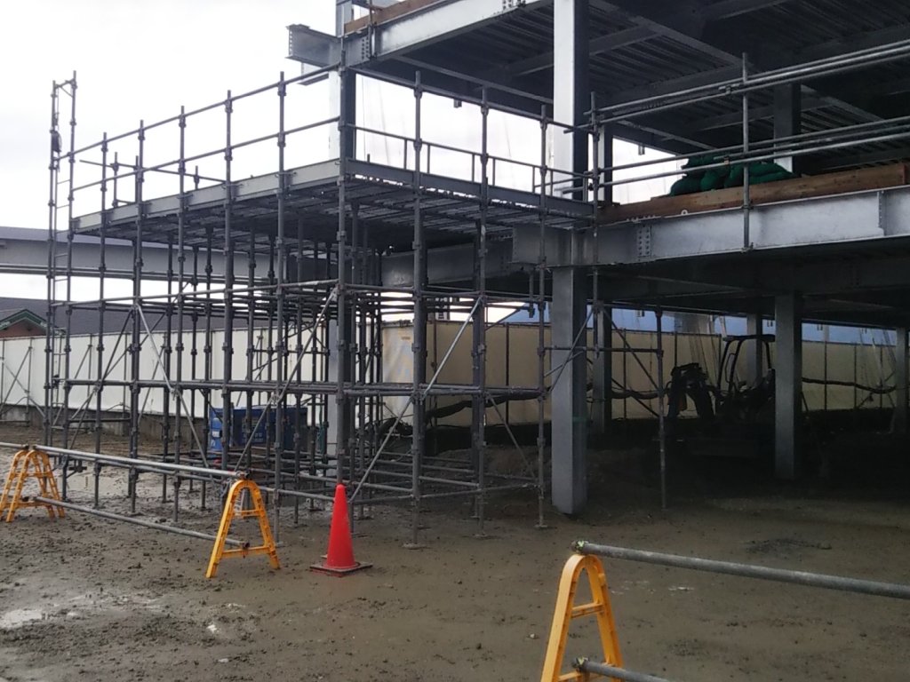 前後の支柱の高さが異なる場合は二側足場と呼ばれ、外壁工事・内部工事など幅広い現場で採用されています。