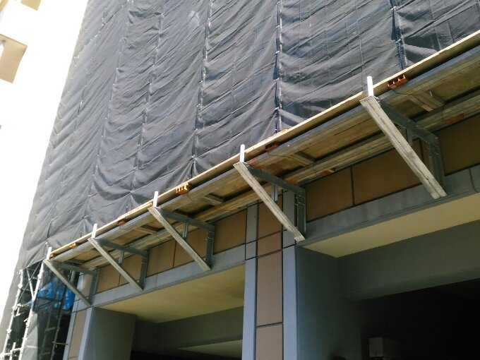 張り出し足場は、建物の構造体に強固に固定した張り出し材(鉄骨などで構成される大型ブラケット状の部材)を外側に突き出し、その上にH形鋼や足場板などを設置し、その上に足場を組む構造です。
