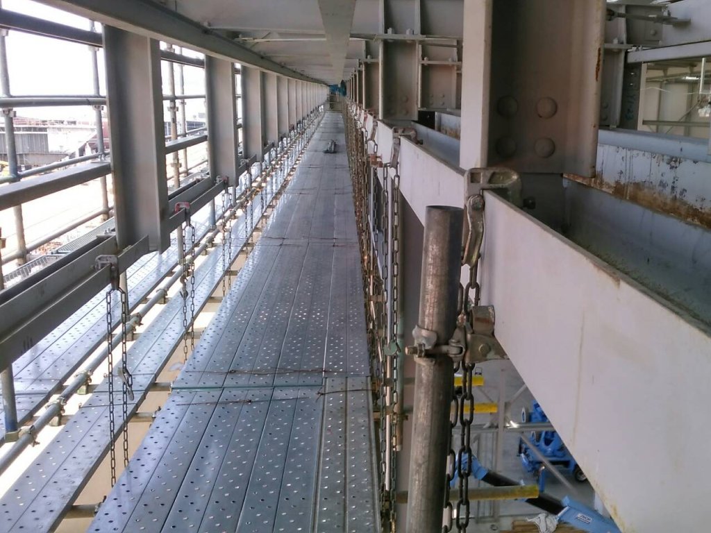 橋桁などの下に吊り下げられ、作業床を敷き詰める足場です。