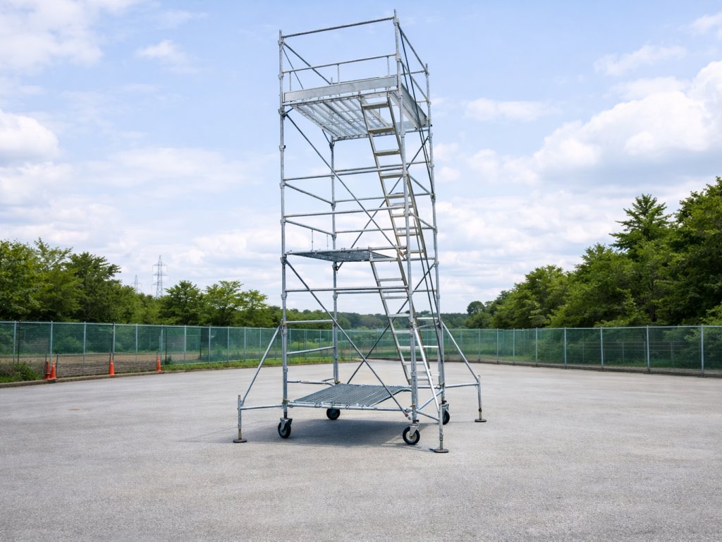 移動式足場(ローリングタワー)は脚輪(キャスター)付きの可動式足場で、内部工事や軽作業で多く使用されます。